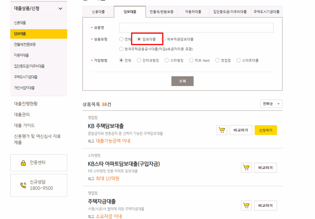 담보대출로 조회를 하면, 여러 상품 목록 중에 “KB 주택담보대출”이라는 상품이 있습니다. “신청하기”를 누르고 설명에 따라 진행하면 됩니다.