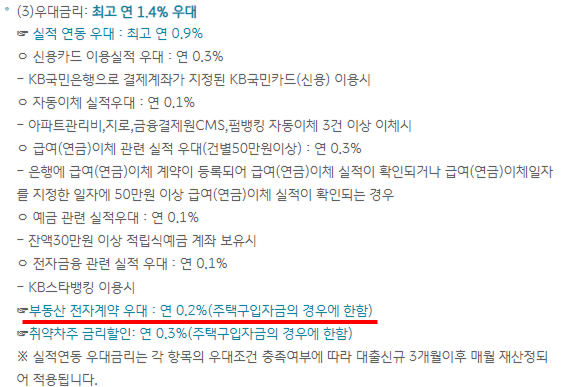 우대금리를 최고 1.4%를 받을 수 있는데, 다른 은행과 마찬가지로 신용카드 실적, 아파트 관리비 이체, 급여 등의 우대금리가 총 0.7%, 30만원 이상 적금 계좌 보유 0.1%, KB스타뱅킹 이용 실적 0.1%로 총 0.9%를 받습니다.