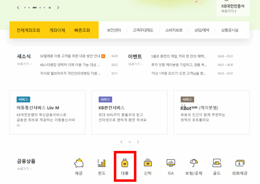화면을 조금만 내리면 “금융상품 > 대출” 이라고 나와있습니다. 클릭