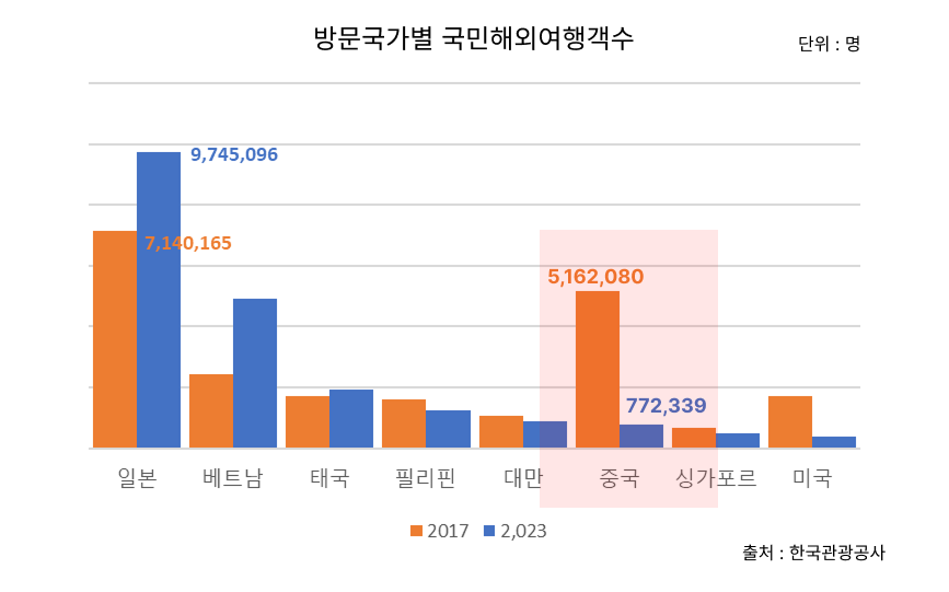 그로 인해 2017년과 2023년을 비교했을 때, 일본인 관광객 수가 200만 명이 증가한 것은 사실입니다. 하지만, 코로나의 발원지로 여겨지고 있는 중국의 경우에는 오히려 500만 명 가깝게 감소하였죠. 그렇다면 이 사람들은 과연 어디로 간 것일까요?